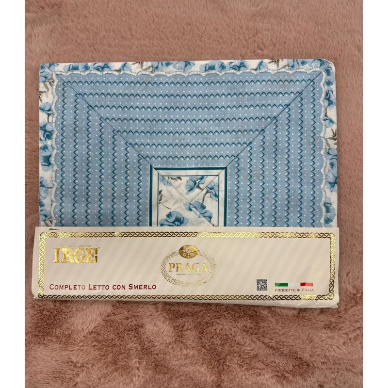 Completo Letto Matrimoniale In Cotone Con Smerlo Irge Fantasia Fiori Azzurri.