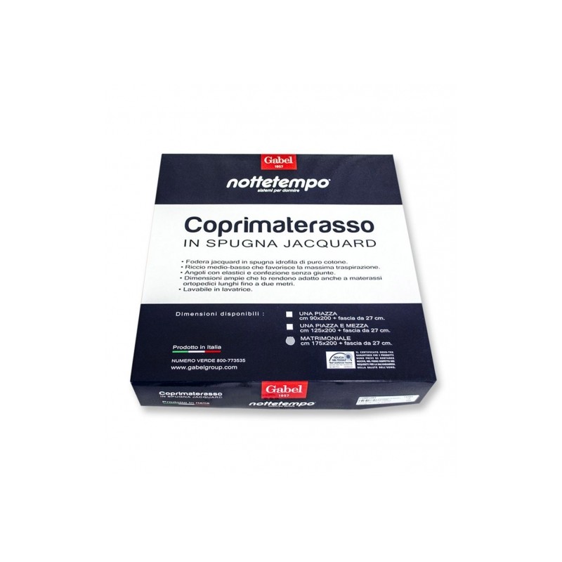 Coprimaterasso Gabel in spugna jacquard. Fodera Jacquard in spugna idrofila di puro cotone. Riccio medio-basso che favorisce la massima traspirazione. Angoli con elastici e confezioni senza giunte. Dimensioni ampie che lo rendono adatto anche a materassi ortopedici lunghi fino a due metri. Lavabile in lavatrice.